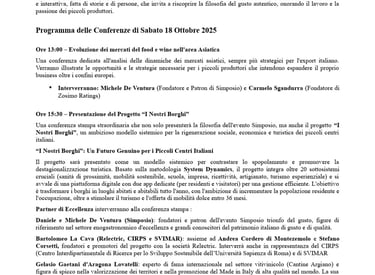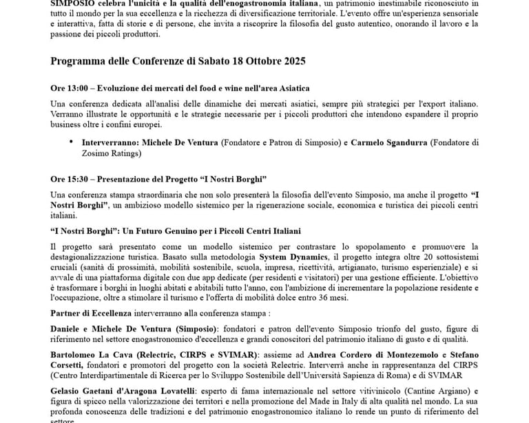 Sabato 18 ottobre 2025 ore 15.30, presso il Salome delle Fontane all'eur (Roma), conferenza stampa per la presentazione del Progetto "I Nostri Borghi" Un progetto sistemico per il rilancio economico, culturale e turistico dei borghi Italiani.